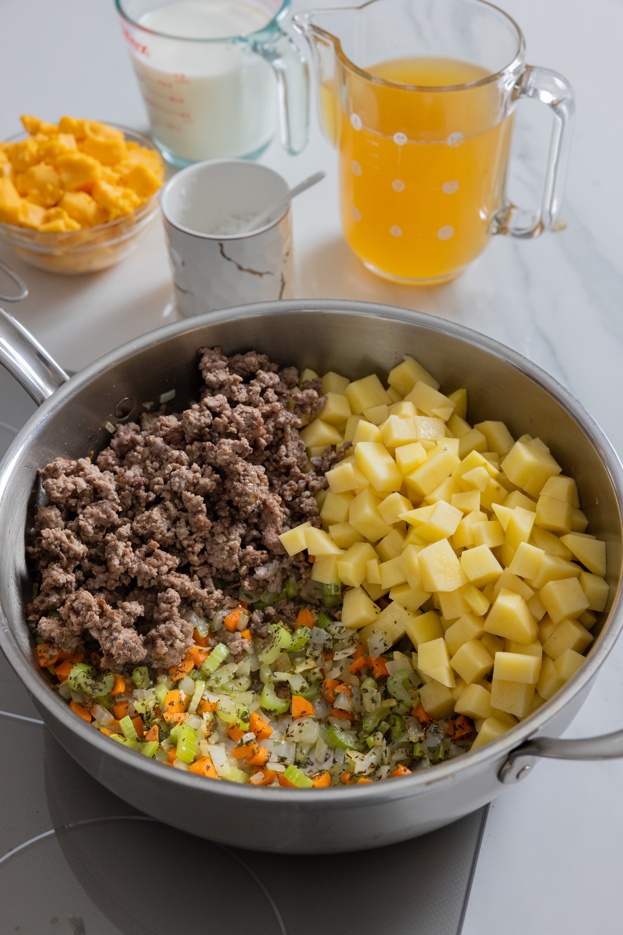 Stir in broth, potatoes, and reserved beef; bring to a boil. Reduce heat; cover and simmer for 10 minutes or until potatoes are just tender. Meanwhile, in a small skillet, melt remaining 3 tablespoons of butter. Stir in flour; cook and stir for 3 minutes, or until bubbly.