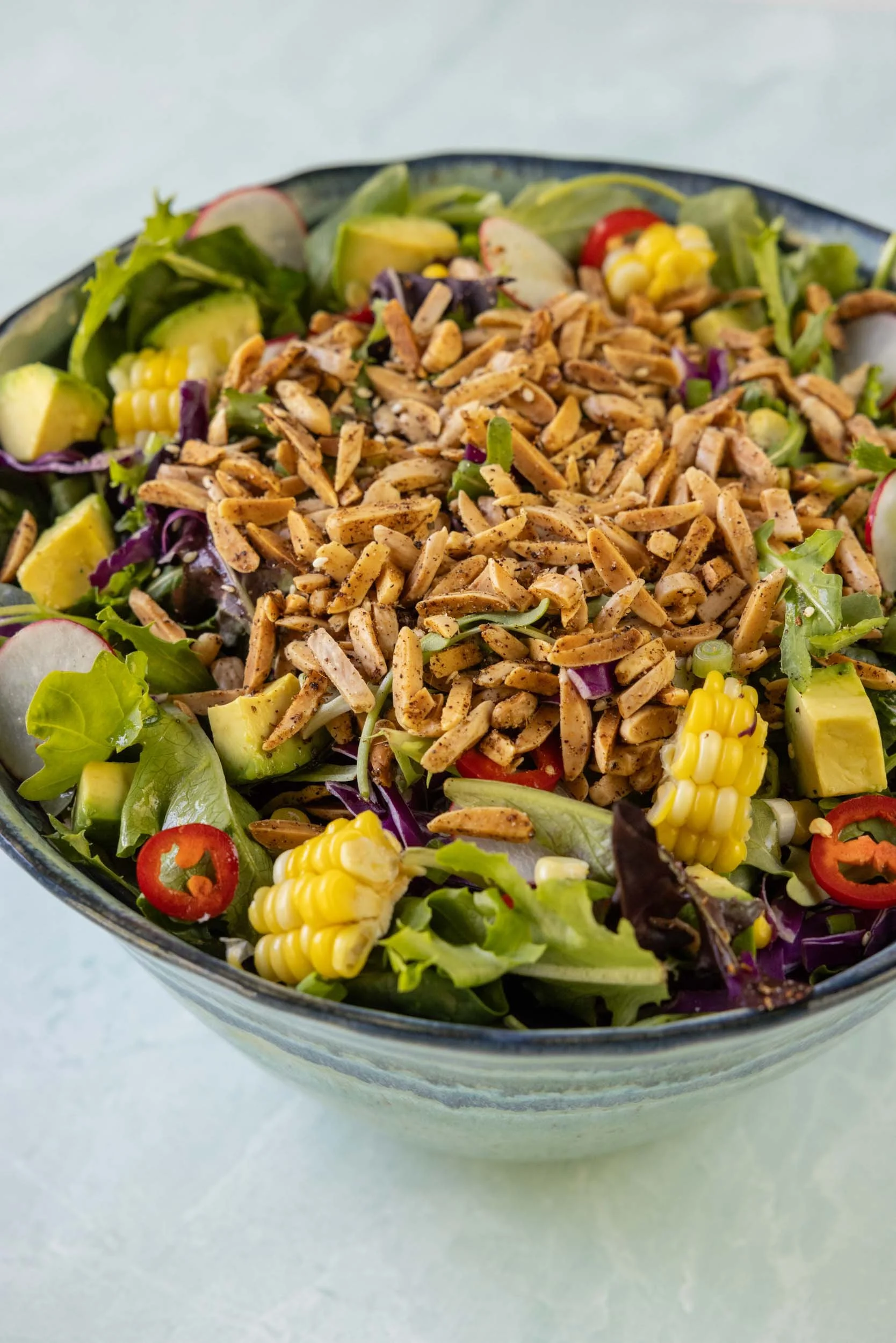 Dukkah is an Egyptian mixture of aromatic nuts, seeds, and spices that is versatile enough to sprinkle on vegetables, feta cheese, rice, or leafy salads. There are many variations of dukkah, using different kinds of nuts and seeds, and it keeps well in an airtight jar for several weeks. For this salad I toss lots of greens with as many fresh vegetables I can find, but feel free to add whatever you like. The dressing is perfectly sweetened with honey and compliments the spicy dukkah topping. Ground sumac berries are optional but add a tangy flavor and gorgeous finish to this already colorful salad.