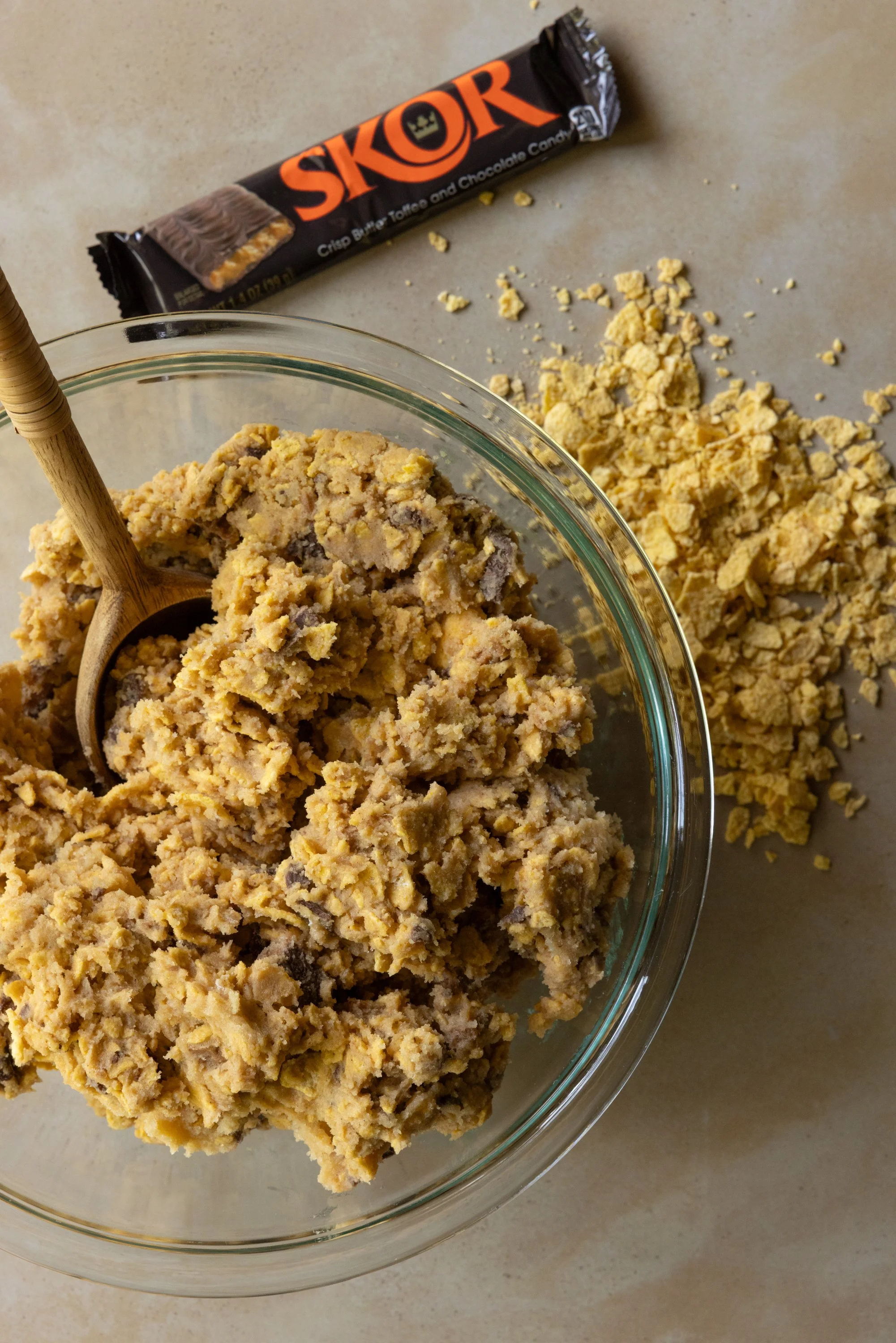 Preheat oven to 350 degrees. Prepare cookie sheets with parchment paper or butter. In the bowl of a mixer, cream the butter, granulated sugar, and brown sugar until very smooth, about 5 minutes. Add the eggs, one at a time and blend until well combined. In a separate bowl, whisk the flour, baking soda, salt, cinnamon, and nutmeg. Add to the creamed mixture and stir until you can no longer see flour. Add Skor candy and gently stir to combine. Form dough into 2” balls and roll in the crushed cornflakes, pressing gently into dough. Place on prepared cookie sheets 3” apart. Flatten each ball of dough lightly with the back of a spoon, and sprinkle with coarse sugar. Bake 13 minutes, until edges of cookies are set. Allow to cool. Cookies keep in an airtight container up to 3 weeks, and they freeze well.