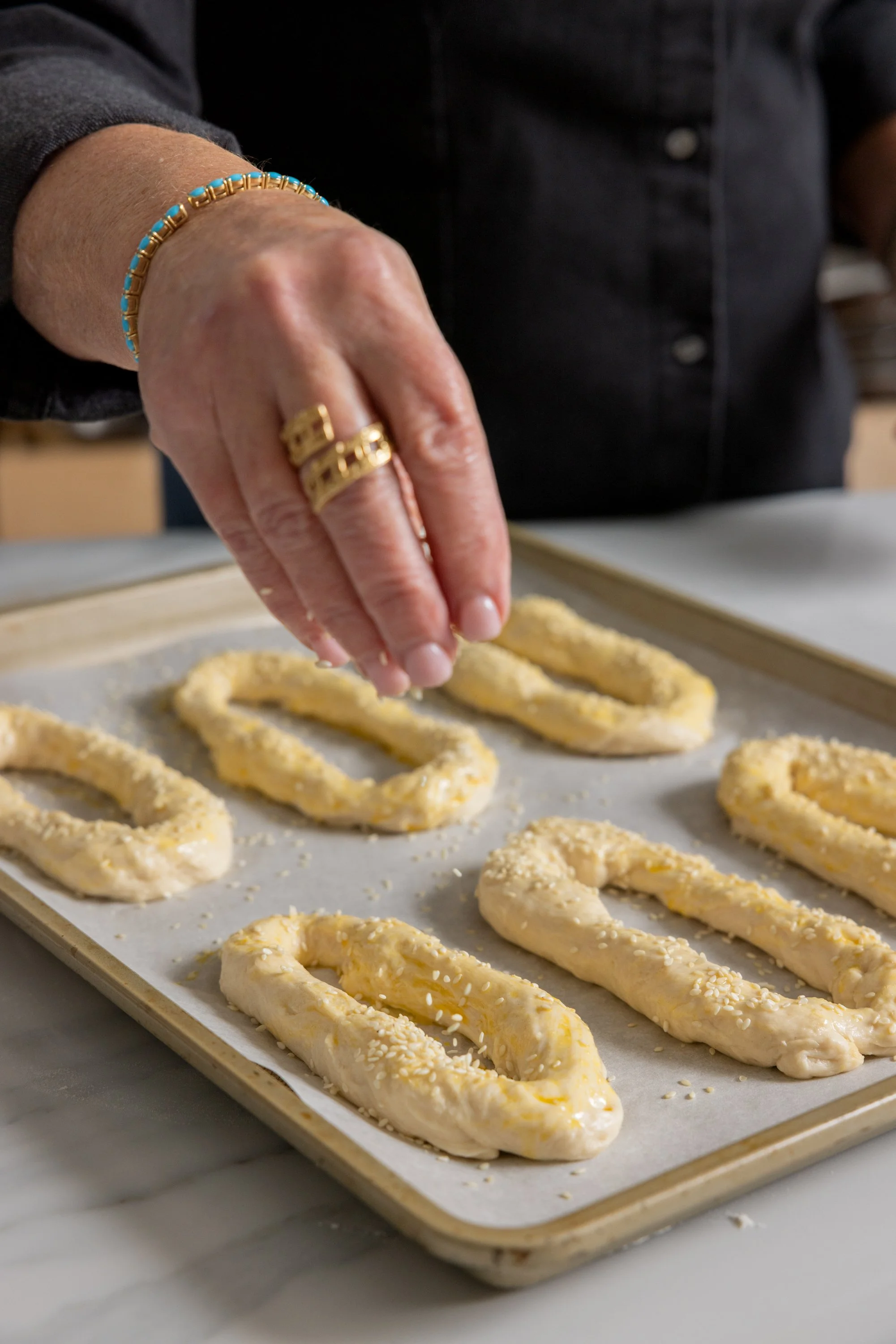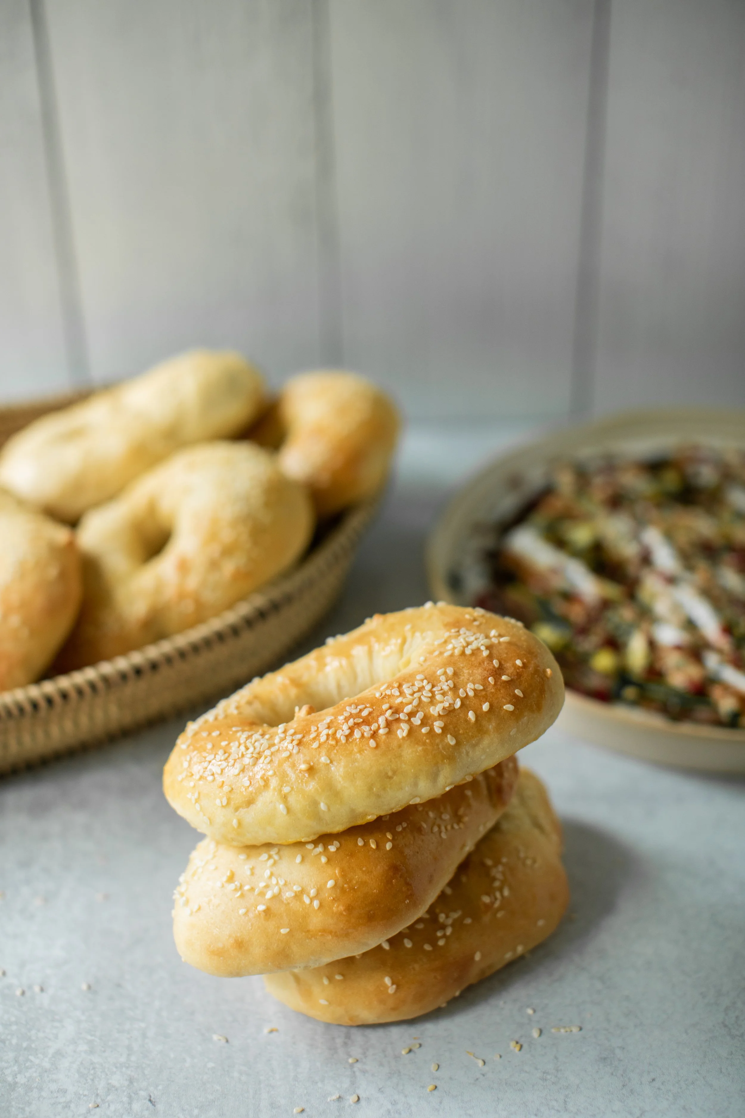 When you enter the Jaffa Gate in Jerusalem you’ll see carts piled high with large rings of crusty bagels. They’re not the bagels we’re used to that are heavy and dense, requiring a thick slab of cream cheese. These are light and airy, and slightly sweet. They’re coated in sesame seeds and sold in a piece of newspaper. Traditionally, they are dipped in the dry spice, za’atar or cumin seeds. I prefer to tear them and smear them into hummus or spicy yogurt. They’re easy to make, but require some time and patience, but It’s worth every second when you pull them from the oven, crispy on the outside and light the inside. They’re best served warm, of course!