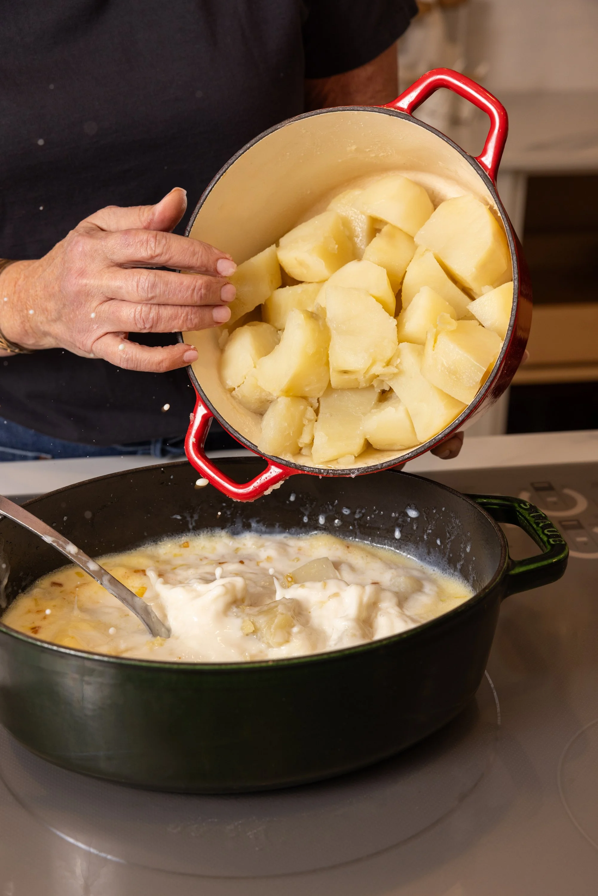 Potato soup is one of the easiest soups to make, and because I love a loaded baked potato, I make my soup with all the toppings I would use on a loaded baked potato, including cheese, bacon, and chives. If that isn’t enough, I add chopped tomatoes and a dollop of sour cream. The soup takes just 30 minutes to make and uses just one pan if you use an immersion blender. I recommend making a double recipe since it reheats easily and makes great leftovers.