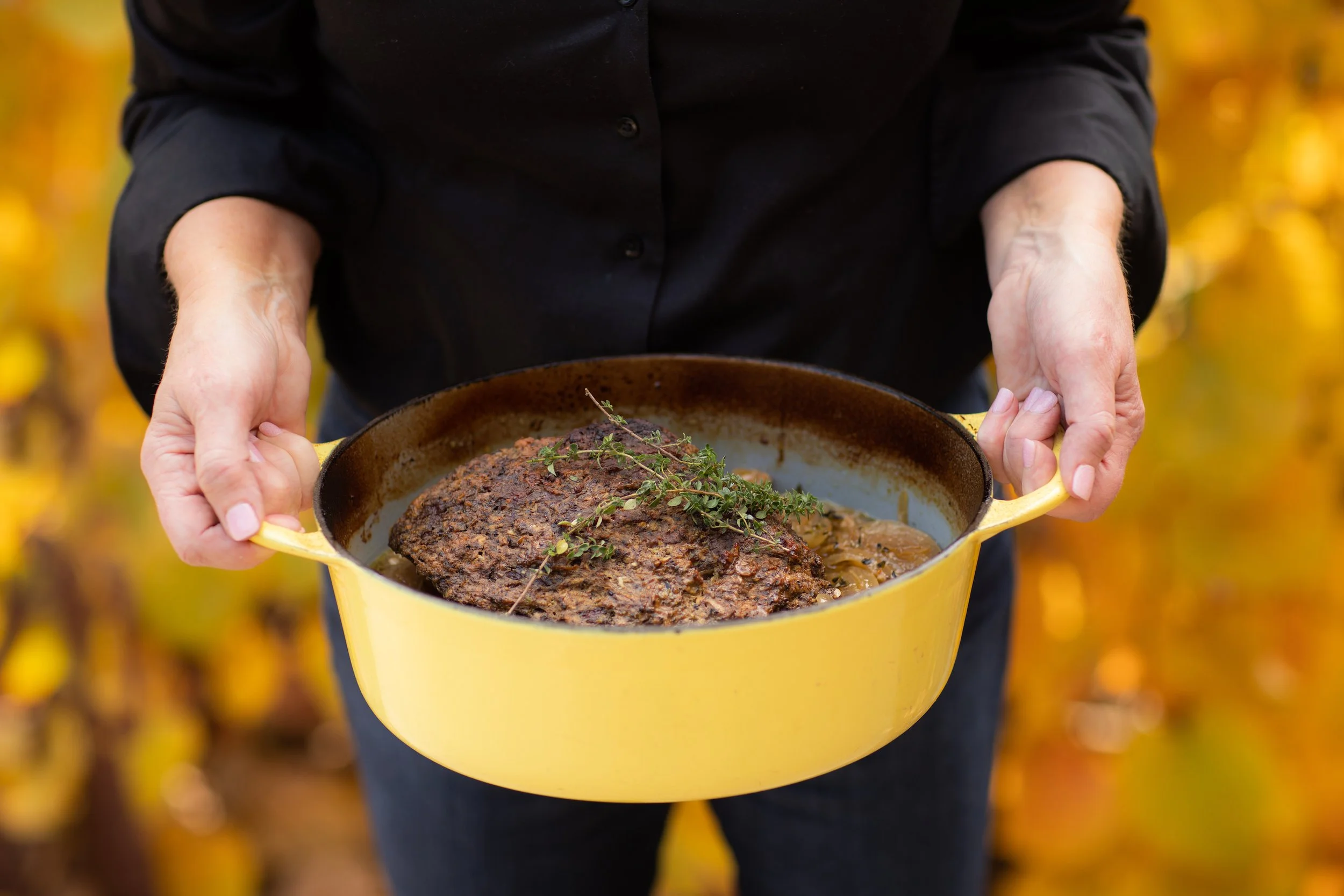 I never got the recipe for my mother’s pot roast, and I’m not even sure she followed a recipe. My fondest memory was the pan in which it was cooked. It was bright yellow, and nearly too heavy for me to carry when I was a young girl. I only recall having roast on Sundays when she cooked it all morning while we were at church. The aroma when we walked into the house was incredible, and I couldn’t wait to sit at the table to devour sliced roast with mashed potatoes. Since I don’t have my mother’s recipe, I’ve created my own that’s packed with the flavors of garlic and mustard. The key is patience and time while the roast is cooking, and since I inherited my mother’s yellow pot, I get to share my childhood memory of pot roast with whomever happens to stop by for Sunday lunch.