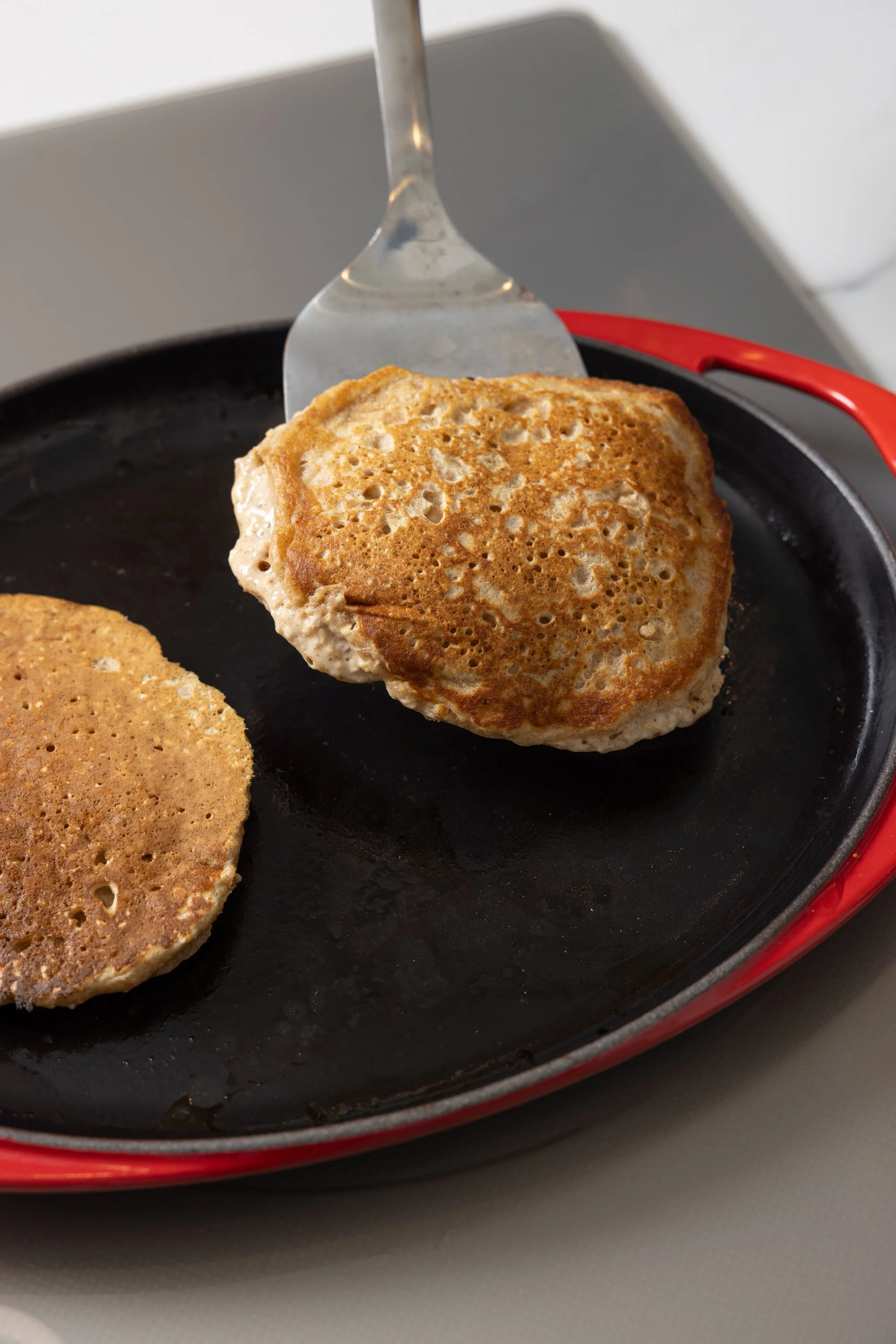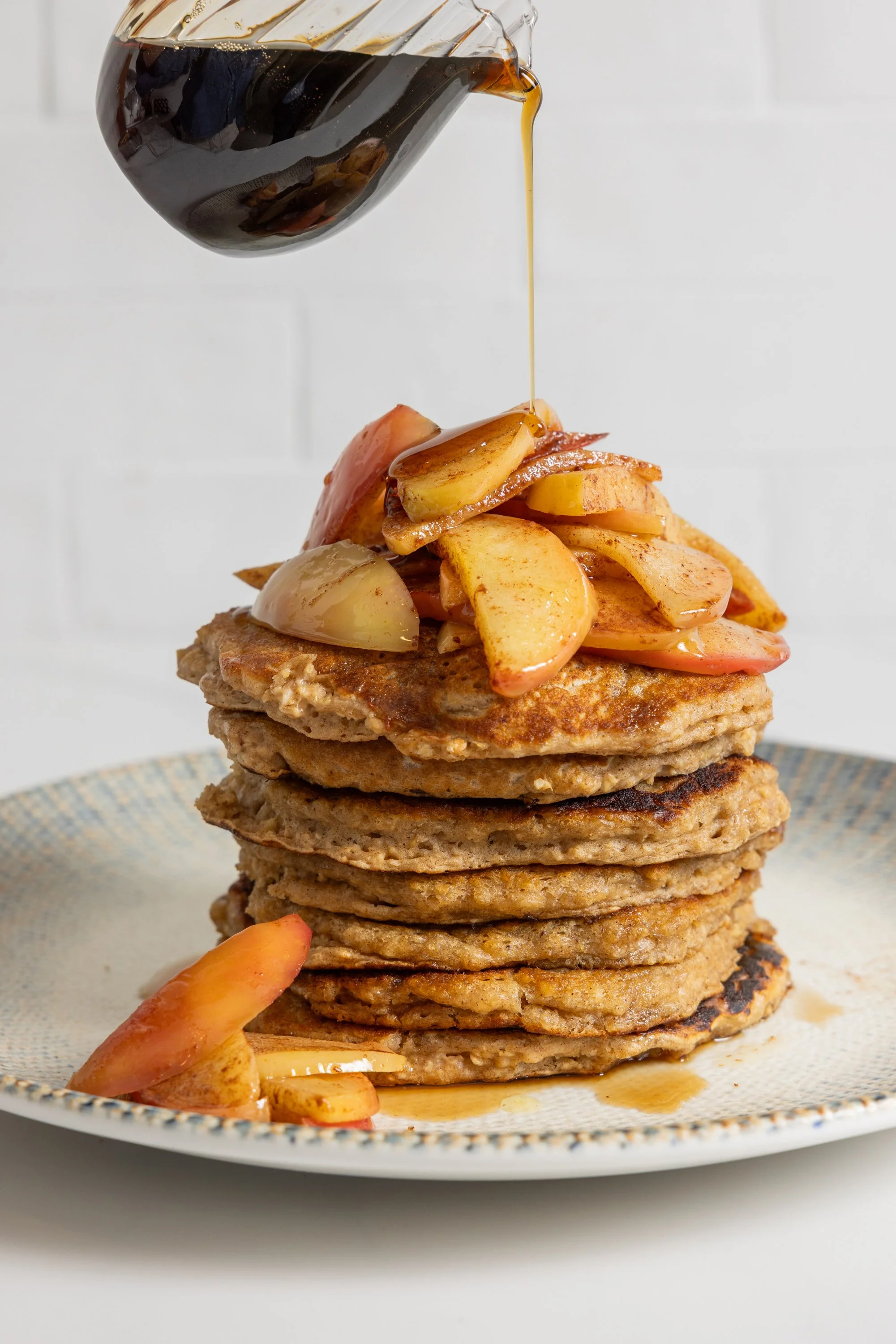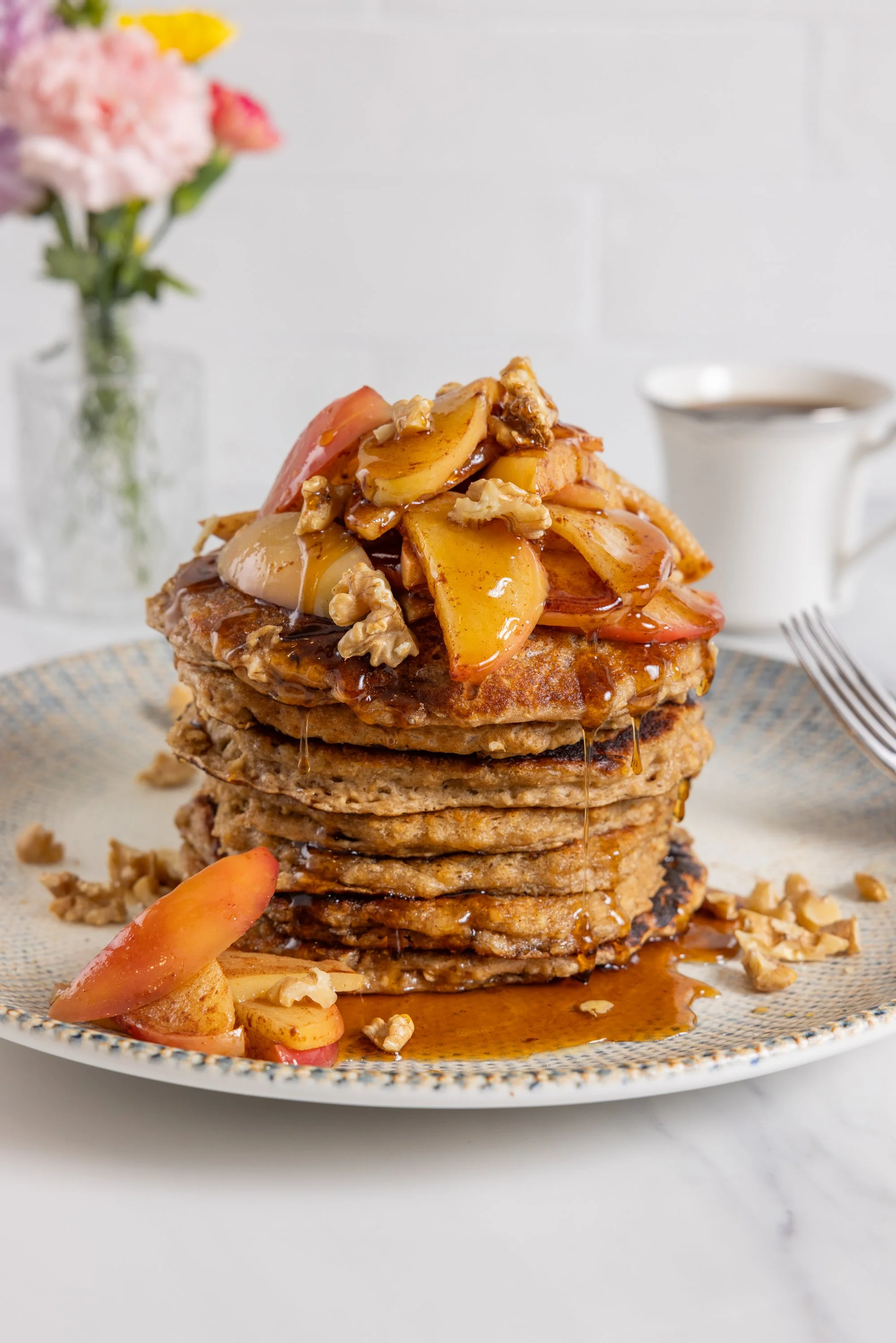 If you're looking for a perfect breakfast to serve your family or guests, here's a good one! These oatmeal pancakes are full of spices, brown sugar, and oats. You can even use gluten-free flour for a great result. I caramelize apples to top the cakes when they're hot and stacked. A sprinkle of toasted walnuts and drizzle of maple syrup are the final perfect touch. These pancakes are sure to make anyone happy!