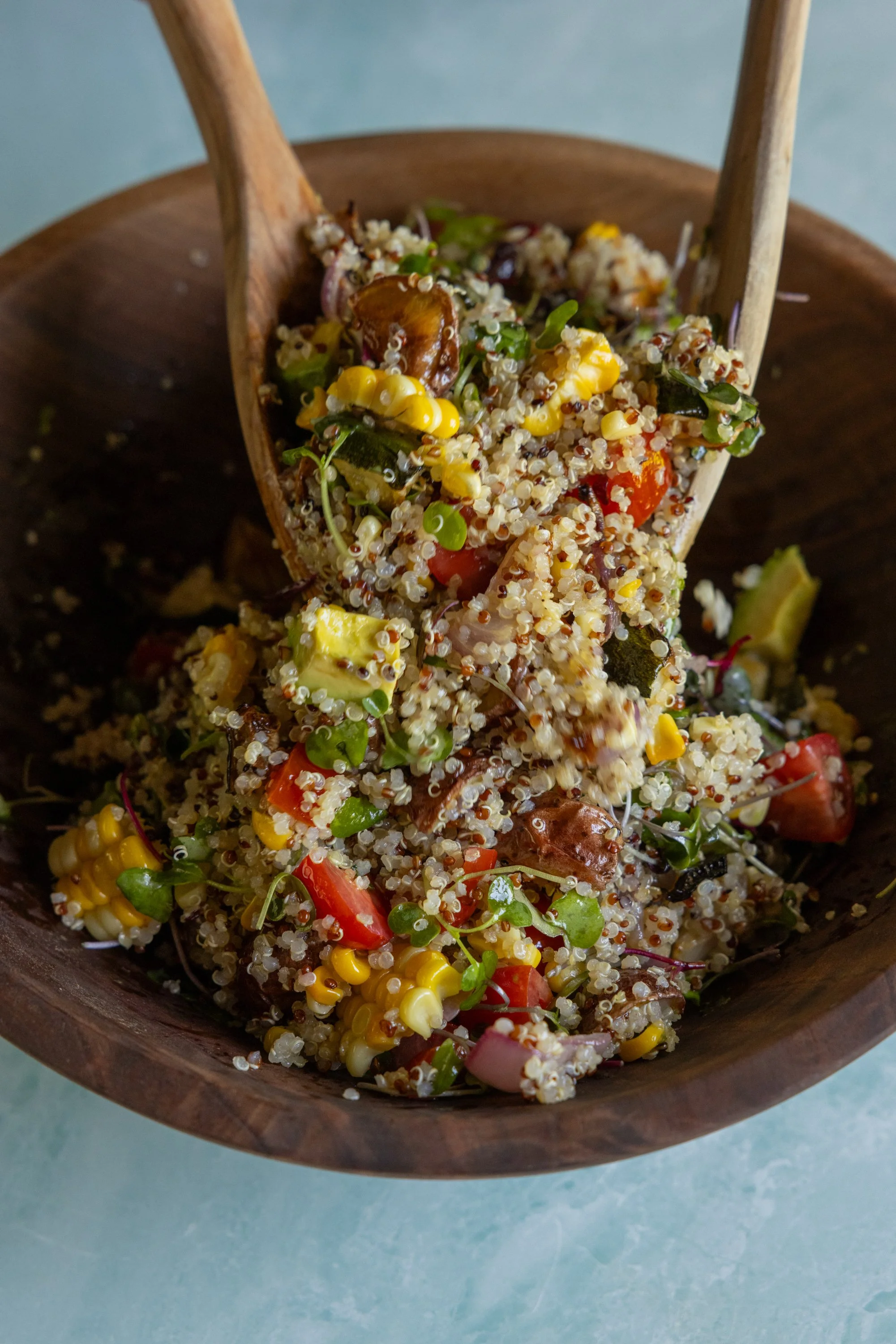 Cook 7 minutes, until kernels are tender. Remove from the water and let cool. Place the corn cob on a board, and using a large knife cut off corn kernels. In a large bowl, combine the quinoa, vegetables, corn, avocado, tomatoes, microgreens, and basil.