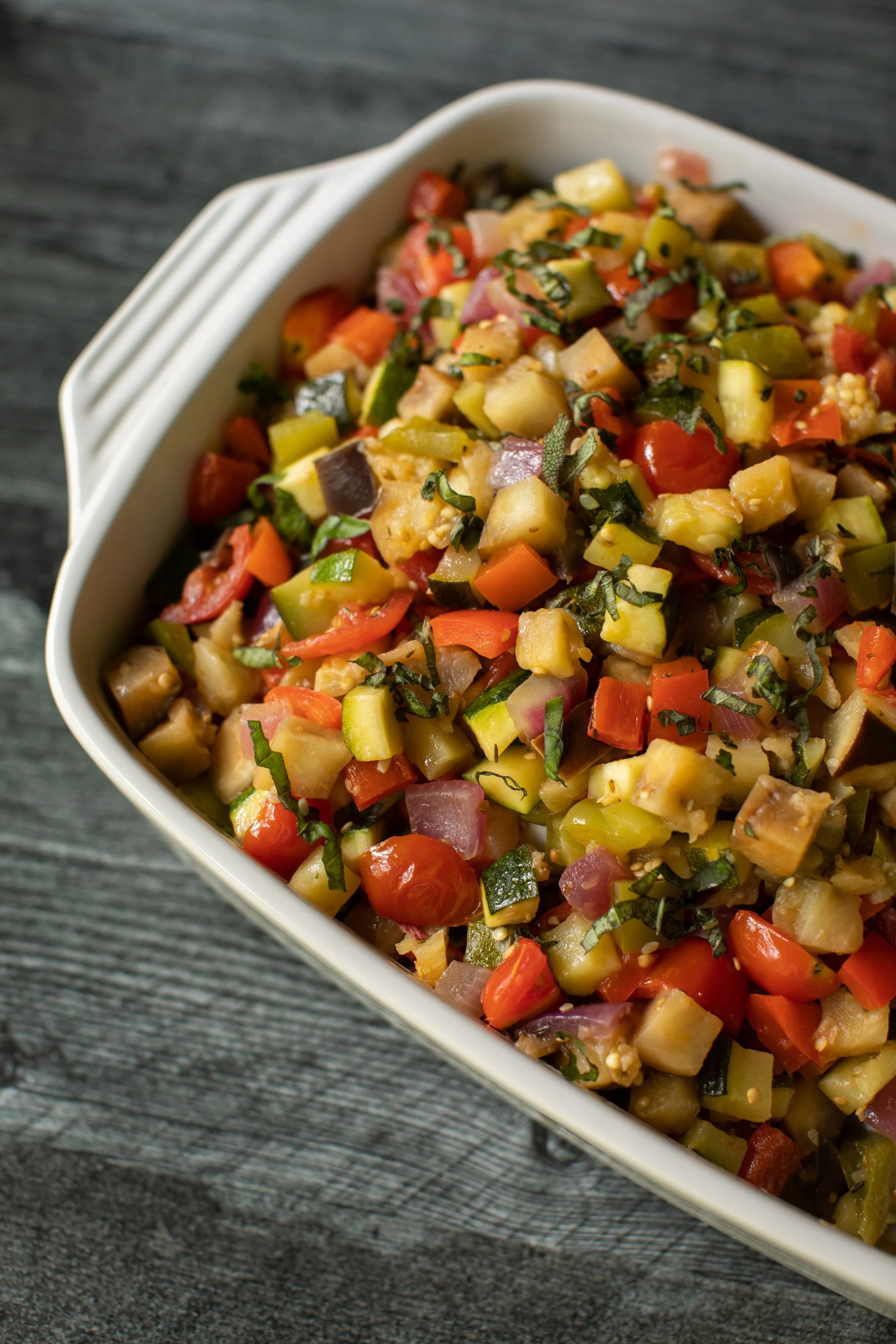 One of my favorite Disney movie characters is Remy, the rat who aspired to become a chef in the movie Ratatouille. The film brought recognition to the dish ratatouille, a popular dish in France. It’s simply a stew made from vegetables and seasonings, particularly those that are in season. Sometimes I make it in a cast iron skillet over an outdoor fire, and the smoke adds another dimension of flavor. I serve it on toasted bread for an appetizer, but it’s also a great side dish for grilled meat and fish. I once stayed at a guesthouse in southern France that served ratatouille every morning with scrambled eggs. This is an easy recipe that can be varied according to what vegetables you have on hand. When you make it, give a little salute to Remy!v