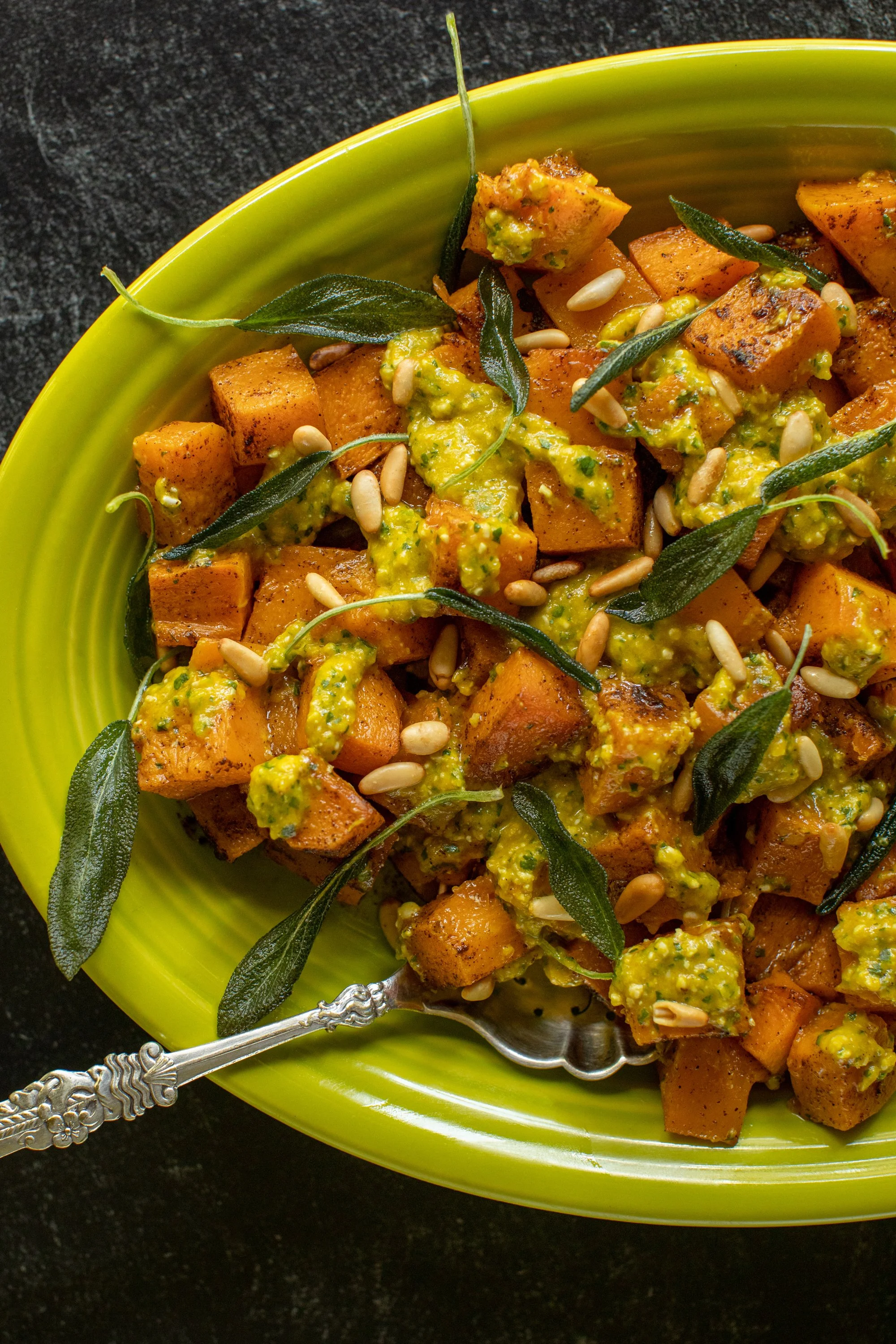 In a small saucepan heat the remaining ½ cup olive oil over medium high heat. Drop 5 or 6 sage leaves into the hot oil and fry for 10 seconds. With a slotted spoon quickly remove sage leaves to a plate lined with a paper towel. Repeat until all sage leaves are fried. To serve, spread the roasted squash on a platter and spoon the pesto all over. Garnish with sage leaves and pine nuts.