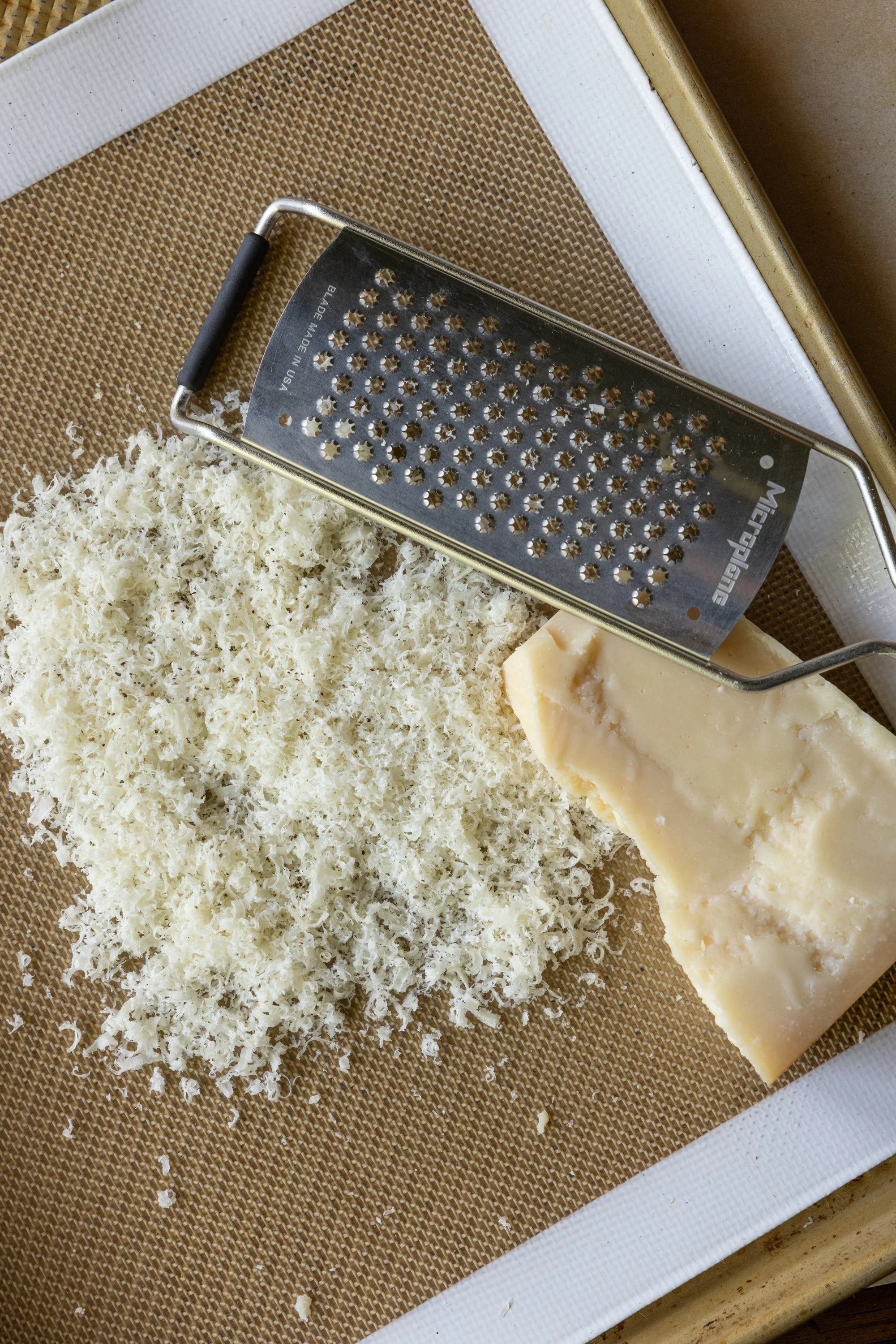Preheat oven to 350 degrees. Line a baking sheet with silicone mat or parchment paper sprayed with non-stick spray. Sprinkle Parmesan cheese into 4 mounds on the sheet and spread out. Sprinkle with black pepper. Bake for 12-15 minutes, until cheese is melted. Remove from oven and allow to cool completely. Meanwhile on another baking sheet, spread the walnuts and bake for 8 minutes, until barely toasted and fragrant. Let cool completely.