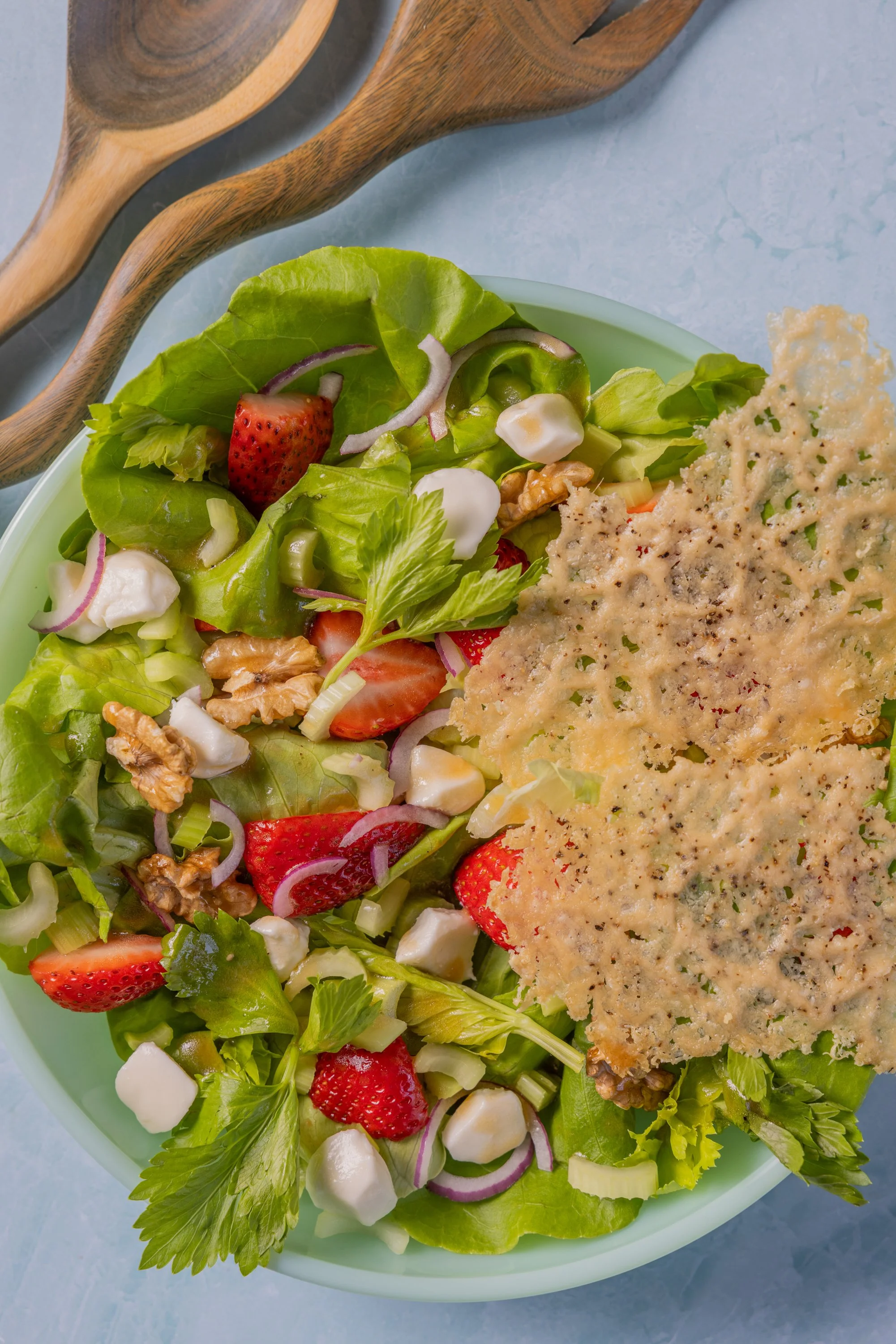 In a medium bowl, combine the strawberries, celery, onion, lettuce, mozzarella balls, and walnuts. Sprinkle with salt. Drizzle dressing and toss. Serve on 4 salad plates and top with a Parmesan crisp.