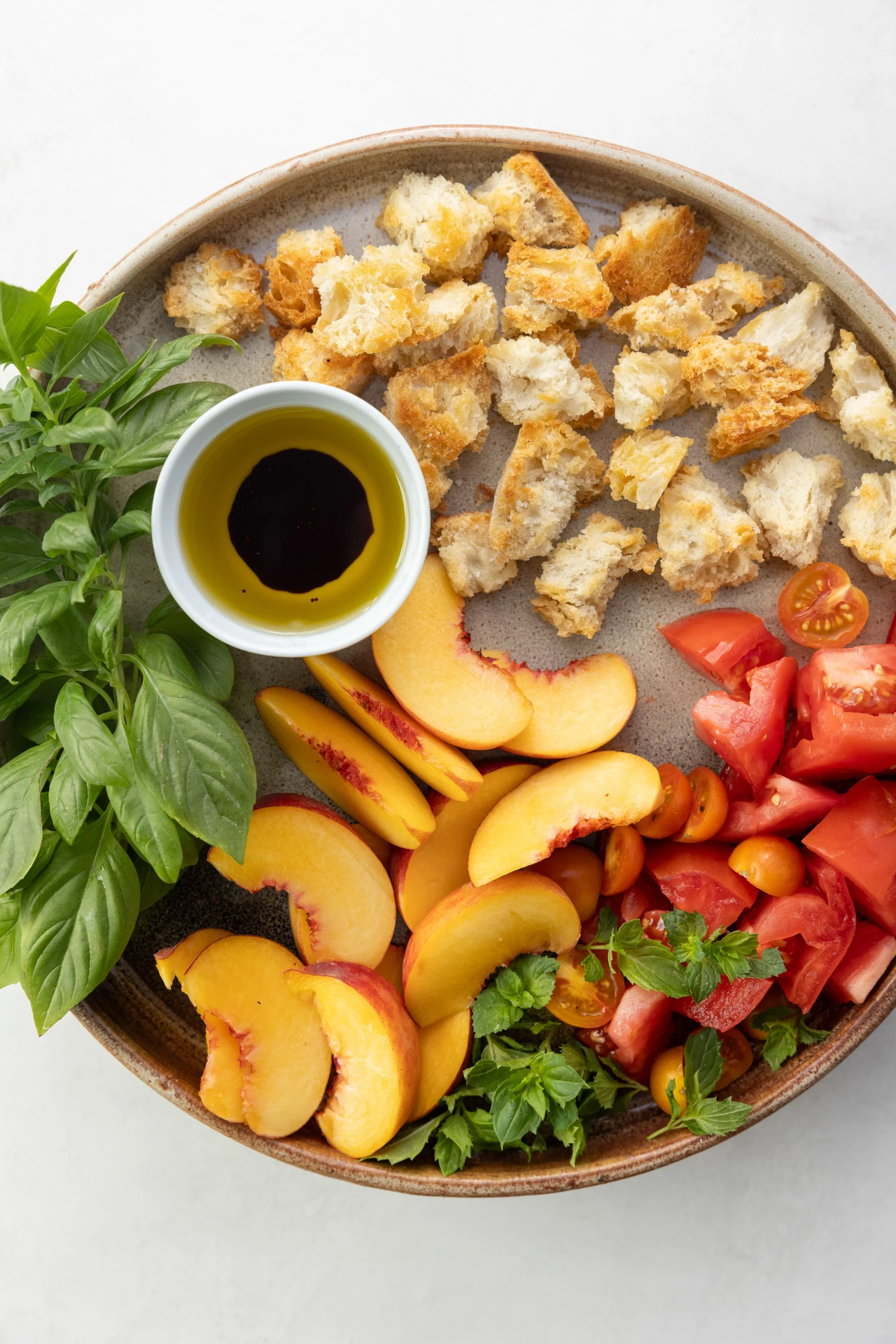 In a bowl, whisk together the olive oil, balsamic vinegar, basil, mint, and 1/2 teaspoon salt. Add the tomatoes and peaches, gently stirring to coat the fruit. Stir in the toasted bread and serve right away.