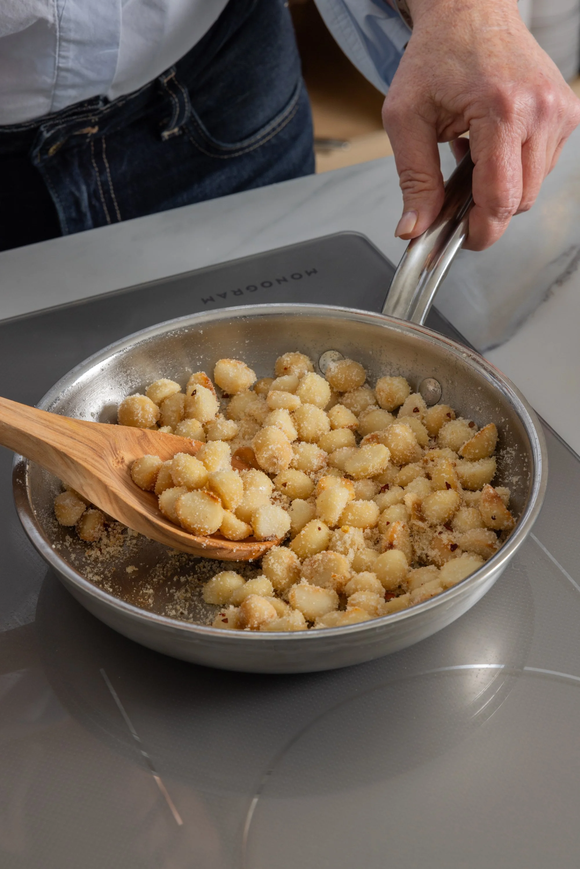 Place the nuts in a small skillet over medium heat and dry roast for 2-3 minutes, stirring occasionally until they are lightly colored on all sides. Add the butter. When it has melted add the sugar, salt and chili flakes. Use a wooden spoon to stir constantly. Cook until mixture becomes thickened, but not burned, about 60-90 seconds. Immediately turn out onto a piece of parchment paper. Allow to cool and then roughly chop.