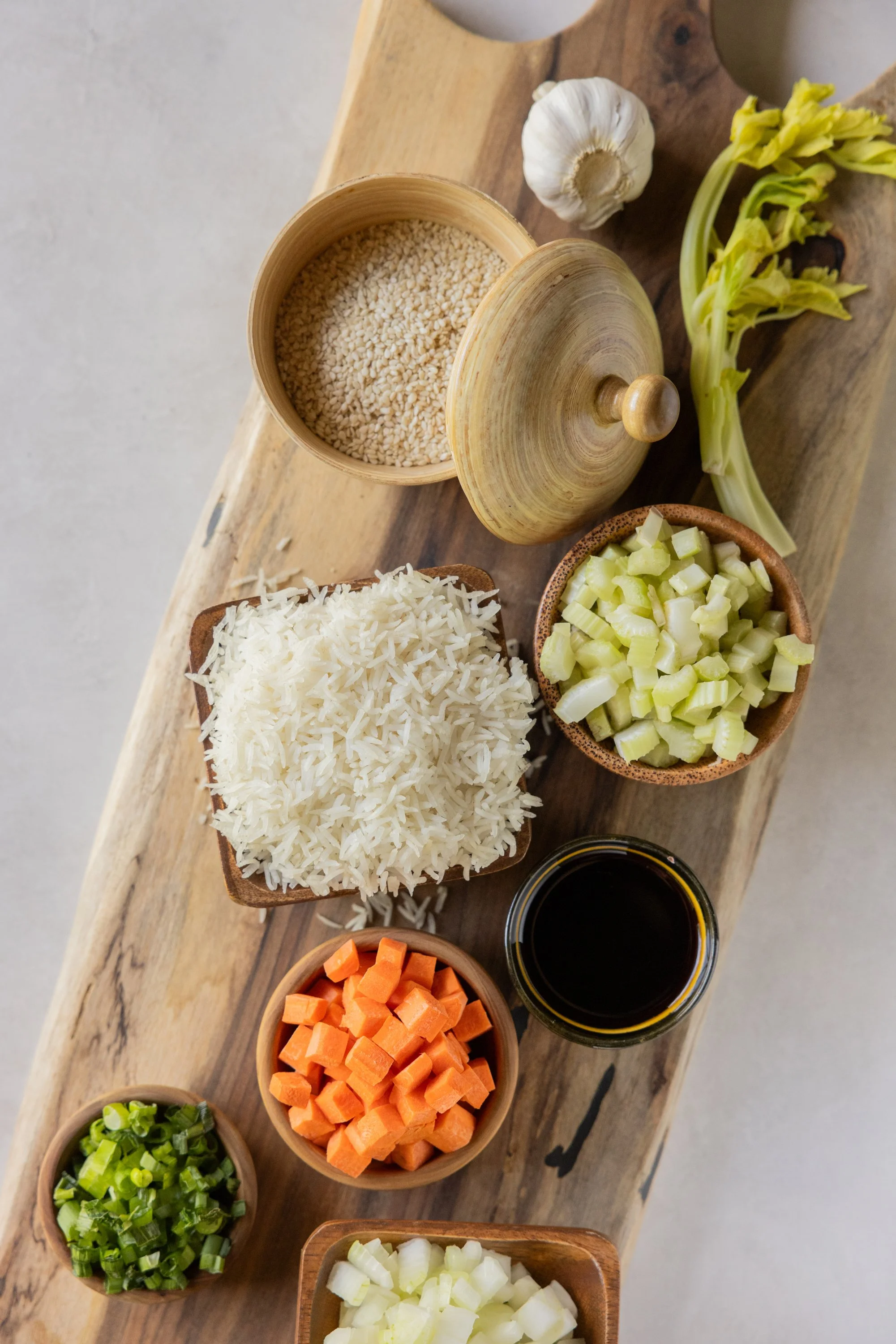 In a small bowl, combine the rice vinegar, soy sauce, sugar, and pepper. Set aside. Heat 2 tablespoons of oil in a large skillet or wok over high heat. Add the onion, carrots, celery, and salt. When the vegetables are soft, add the garlic and cook for one minute. Add the rice and let sit for a minute so it the bottom crisps up a bit. Stir and pour in the sauce mixture. Make a deep well in the center and add 1 tablespoon of oil. Pour in the eggs, and let cook just until set, stirring for about 1 minute until they are “scrambled eggs”. Give one last stir to incorporate the eggs and transfer to a bowl. Sprinkle green onions and sesame seeds and serve.