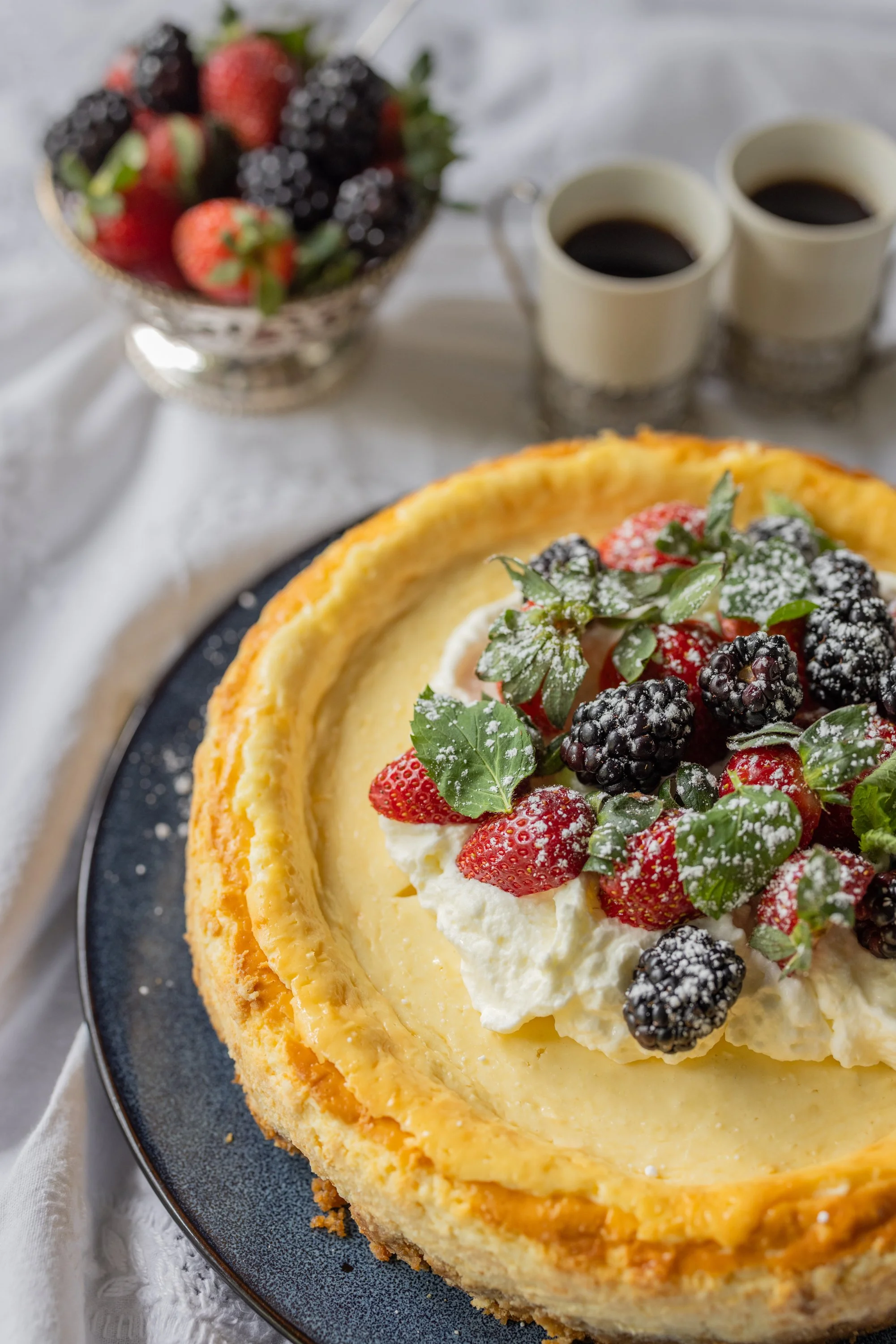 This may be one of the best desserts in my collection. I’ve even been told by friends who claim they don’t like white chocolate that this is the best cheesecake they’ve ever eaten. If you want to make it extra decadent, substitute crème fraiche for the sour cream. It tastes richer, a little less tangy, and results in a creamier texture. Although this cheesecake is delicious on its own, it can be served with chocolate sauce, caramel sauce, or simply with berries and whipped cream.