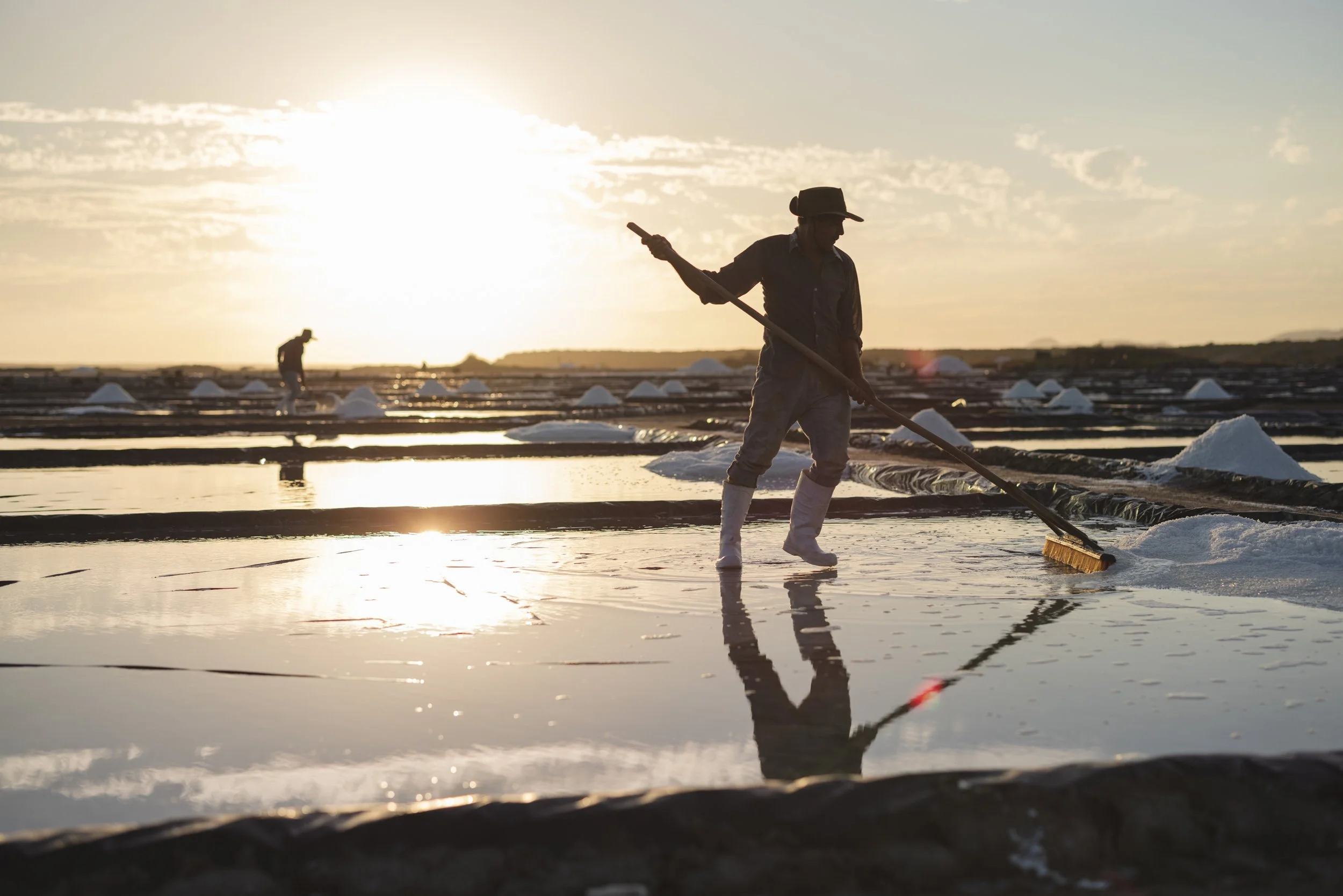 Saltwater is pumped from underground and put into “pans” or pools lined with black plastic sheeting. After a couple weeks the water evaporates, and impurities are skimmed from the top, leaving a thick layer of pure white salt crystals. To collect it, one must use a salt broom to move the salt into piles, which are shoveled into barrels and dumped into huge hills of salt. It is a very laborious job, and due to the daytime heat, workers show up in the mornings and evenings to collect and move the salt. During our visit, families arrived to harvest together, some having worked there for their entire lives. We walked around for nearly three hours, trying our hand at sweeping salt and climbing the salt hills as we waited for sunset.