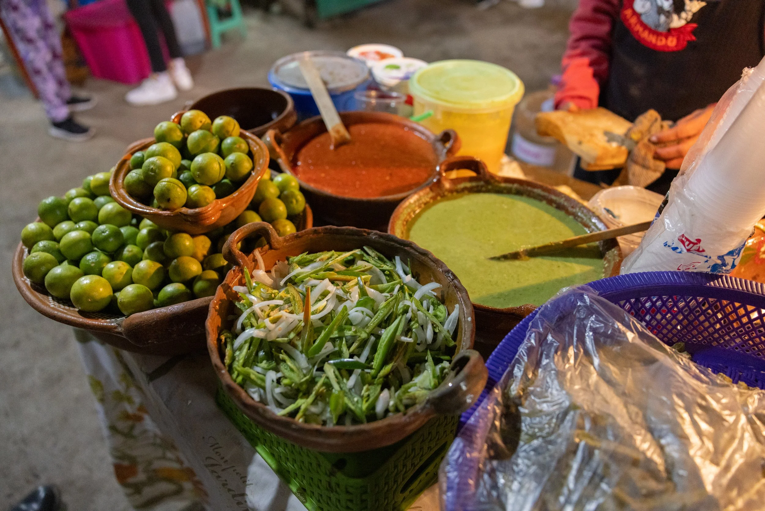 In Mexico, many families fire up the barbacoa on Saturday night so the meat can cook all night and be enjoyed on Sunday morning after mass. In Texcoco, you must arrive by 8 am if you want to witness the removal of the dirt and leaves to reveal the steaming and aromatic meat. If you’re staying in Mexico City, as we were, you must drive 1 ½ hours to experience this excitement, and I was ready for it. Paco’s friend, Saúl Torres and his wife, Veronica own El Pica 1, one of the largest barbacoas in the area. Under canopies of trees there were colorful tables and chairs neatly arranged, which would soon be filled with families celebrating their favorite day of the week. In a large open-air stone building with a tin roof, people stood behind dozens of tables covered in colorful tablecloths, making salsas and tortillas. Huge iron pots were filled with oil bubbling with fried chicharrónes, plantains, and corn cakes. There was a table lined with clay vessels filled with pulque, a beverage made from fermented agave sap. Some were mixed with coconut water, while others were flavored with pineapple and cactus. We sampled them all.