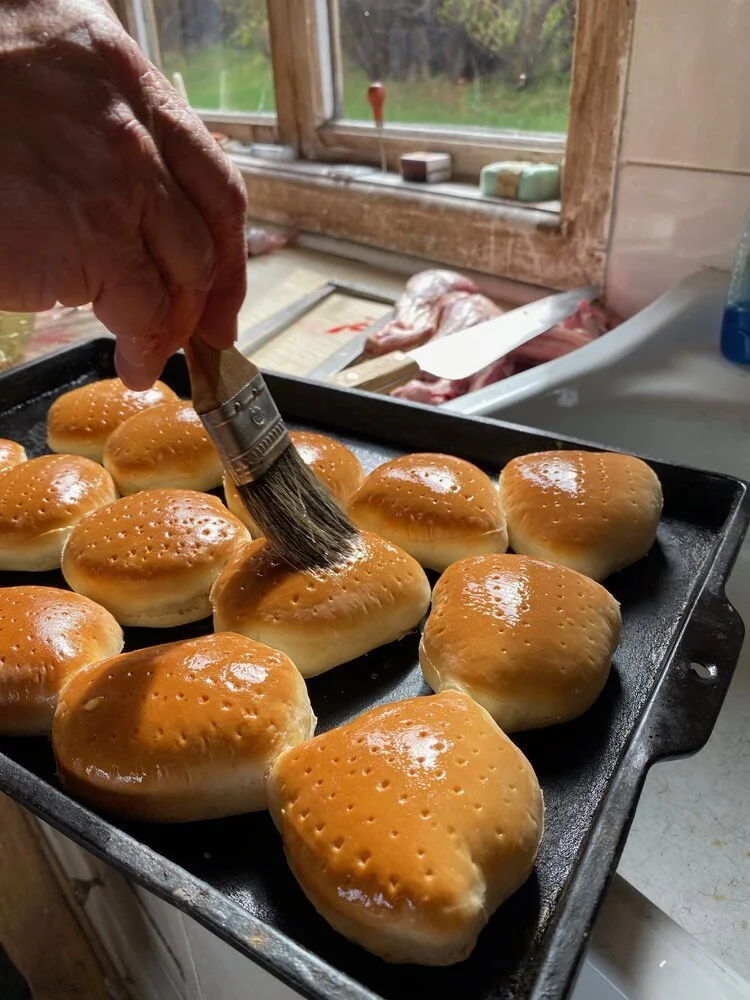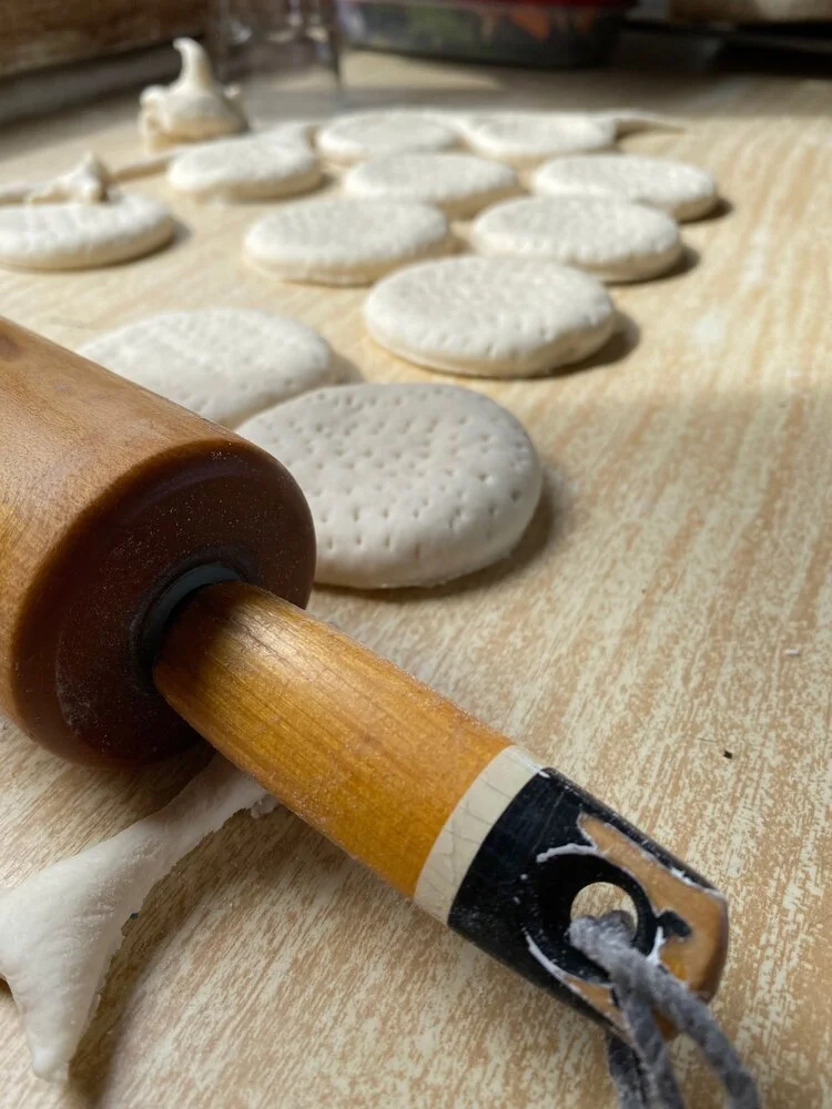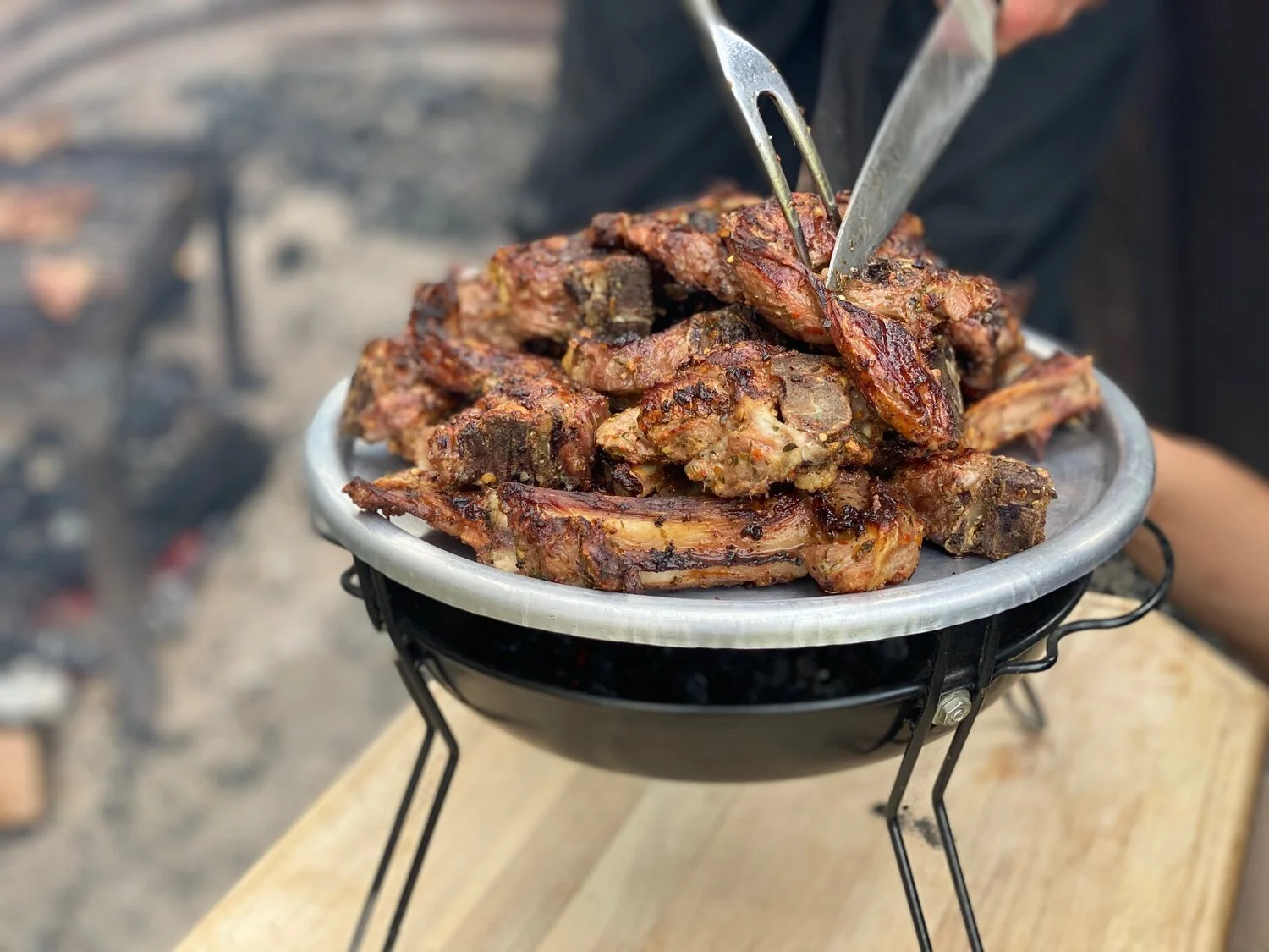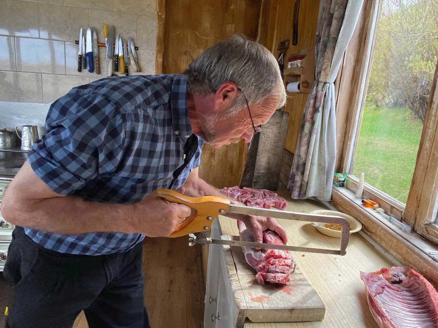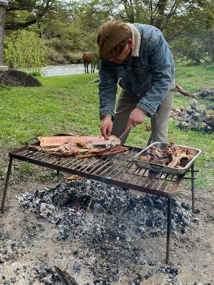 Not far from our hike, we drove to the home of Victor Sharp, a sheep farmer who lived with his 28 year-old son, also named Victor. They lived in a farmhouse at the base of a huge mountain range. They owned hundreds of hectares of land where they raised sheep and a few horses. They had slaughtered a lamb that morning to cook for us on our visit. When we arrived, Victor Jr. appeared in his gaucho apparel anxious to show us their home. Victor Sr. was busy in the kitchen rolling bread dough for the pan amasado. After cutting the dough into rounds with a drinking glass, he placed the dough on a baking sheet to rise on the warm century-old wood-fired stove. He didn’t speak English, but Victor Jr. had studied in Arkansas in the U.S. for a year during high school, and spoke very good English. His father brought in a side of lamb and carefully cut it into small pieces with his saw on a small cutting board next to the sink. He liberally sprinkled salt all over the meat and tossed it with dried oregano and chimichurri before taking it outside to the grill that had been heating over live coals for hours. Meanwhile, Michelle peeled and halved potatoes that Victor Sr. again sprinkled liberally with salt before placing in the oven. The bread had just come out of the oven, and Victor added more wood for the potatoes to cook at the highest temperature possible.